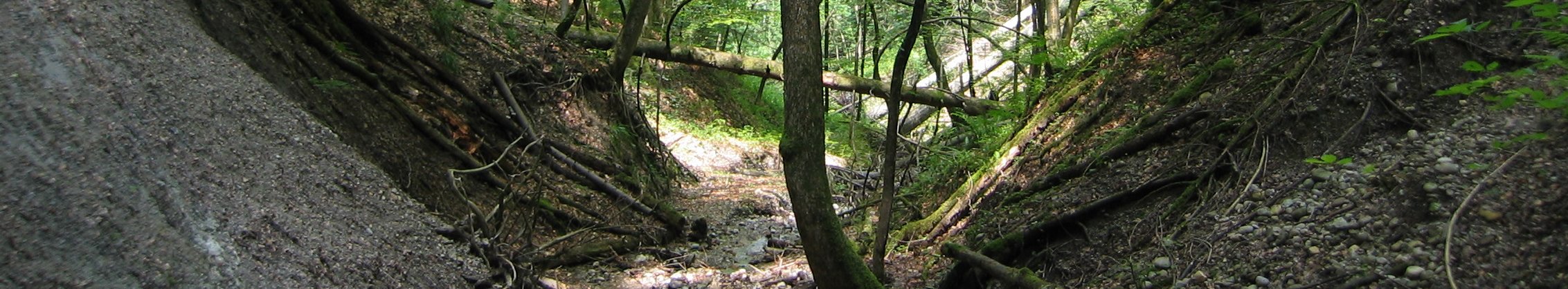 - Wald im «unteren» Gerinneeinhang schützt vor Erosion und Rutschung, bildet aber ebenfalls eine Quelle für Schwemmholz.
