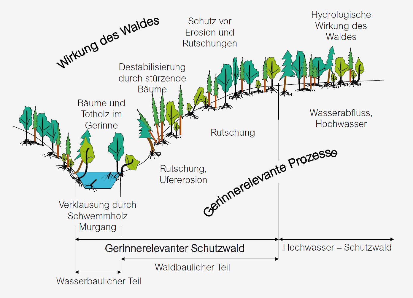Die Wirkung des Waldes in Gerinnenähe muss differenziert betrachtet werden. Einerseits erbringt der Wald eine schützende Wirkung gegenüber den Gefahrenprozessen, andererseits können umgestürzte Bäume zur Gefahr werden. Die nebenstehende Darstellung (Abb. 2) gibt einen schematischen Überblick über die Zusammenhänge.