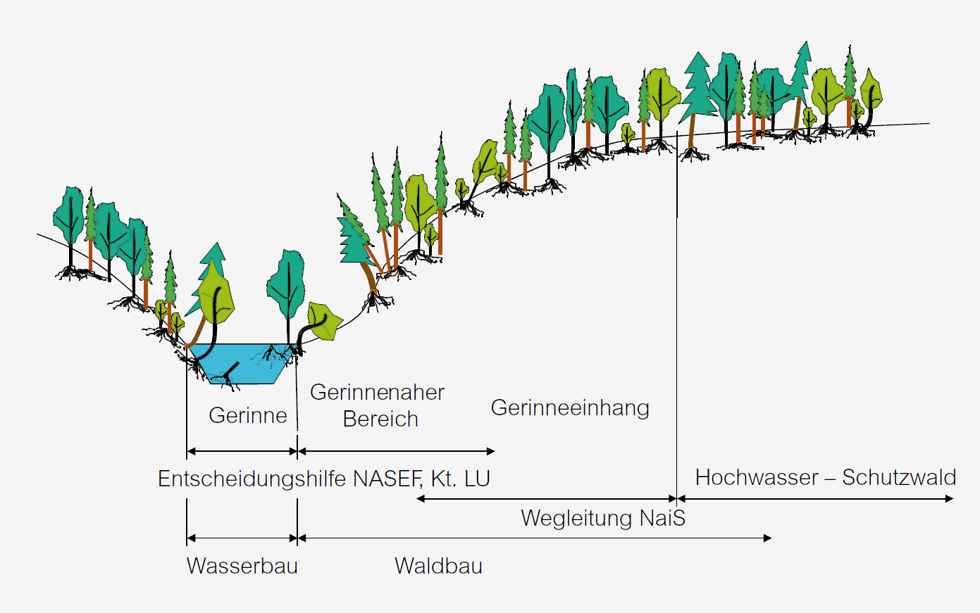 Grundsätzlich gelten die Anforderungsprofile nach NaiS (Nachhaltigkeit und Erfolgskontrolle im Schutzwald). Diese Anforderungsprofile setzen sich zusammen aus den Anforderungen aufgrund der Naturgefahrenprozesse Rutschung und Erosion und des Standortes. NaiS enthält jedoch für das Vorgehen im unmittelbaren Gerinnebereich wenig konkrete Hinweise. Der Kanton Luzern hat für diesen Bereich die Entscheidungshilfe NASEF erarbeitet.