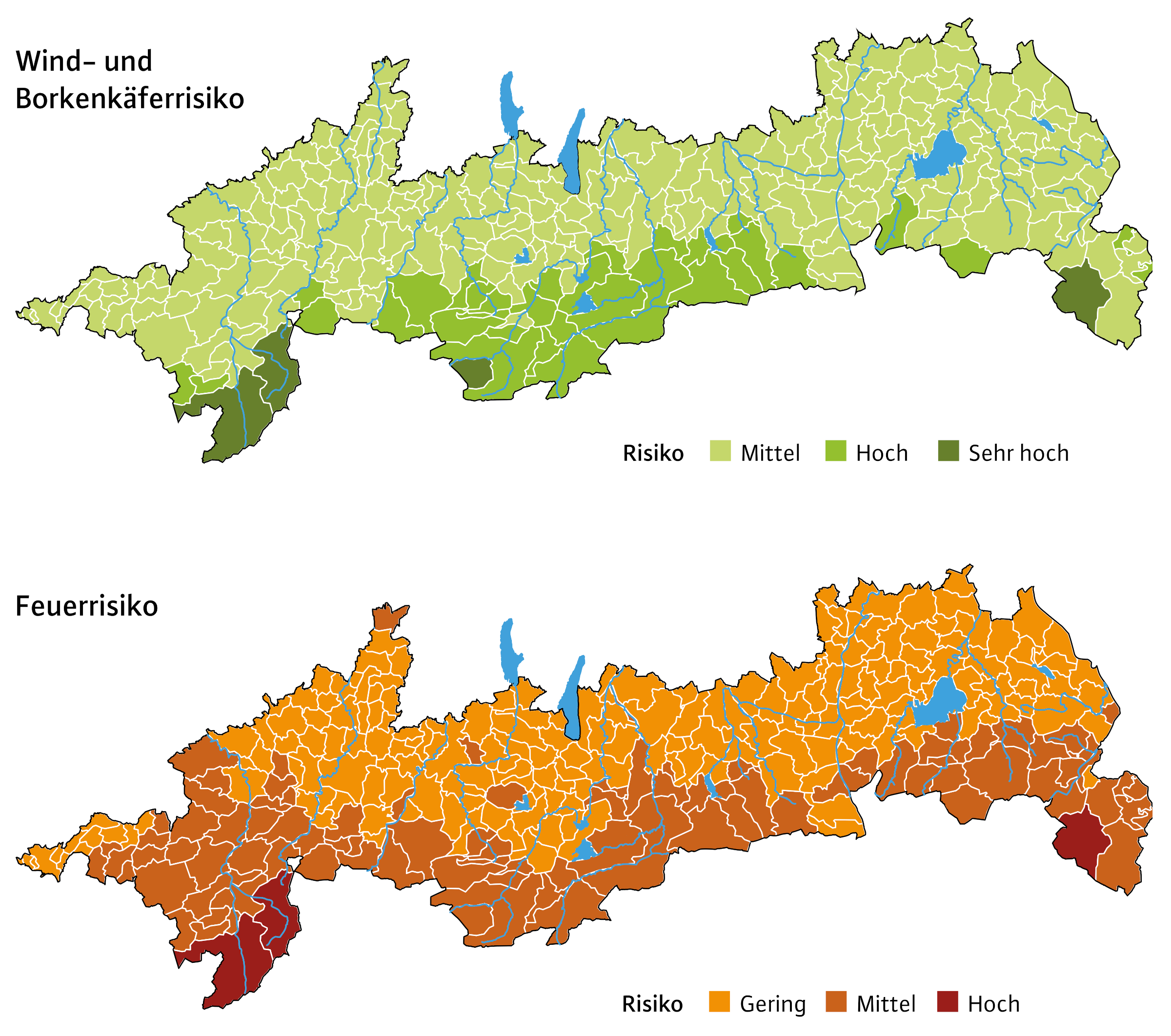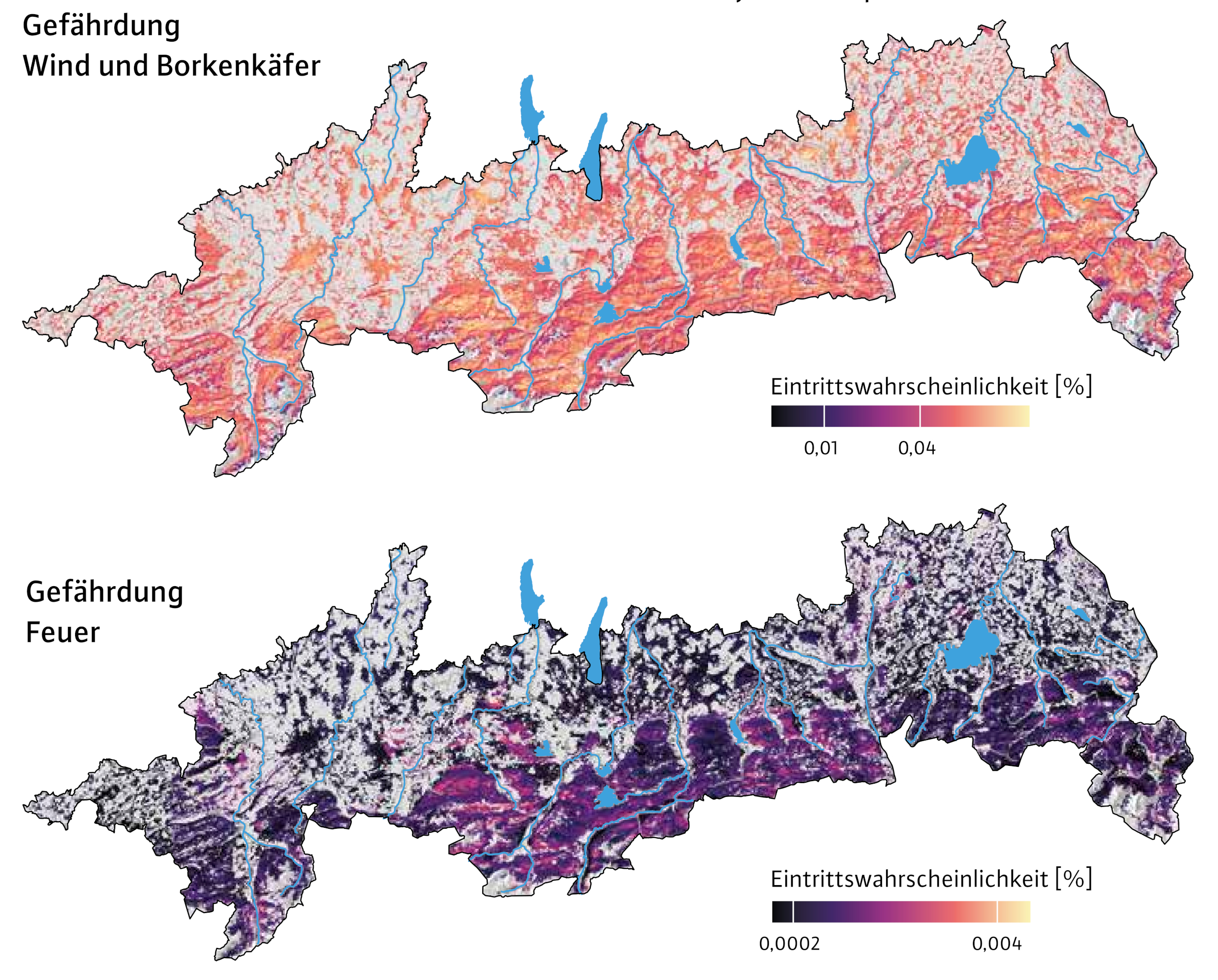Wenn man neben Gefährdung und Vulnerabilität des Waldes auch den Schutzbedarf vor Naturgefahren berücksichtigt, ist das Gesamtrisiko für Schutzwälder durch Wind und Borkenkäfer im äußersten Westen und Osten des Bayerischen Alpenraums am höchsten. Die in dieser Studie erstellten Informationen sind als Online-Karten frei verfügbar.