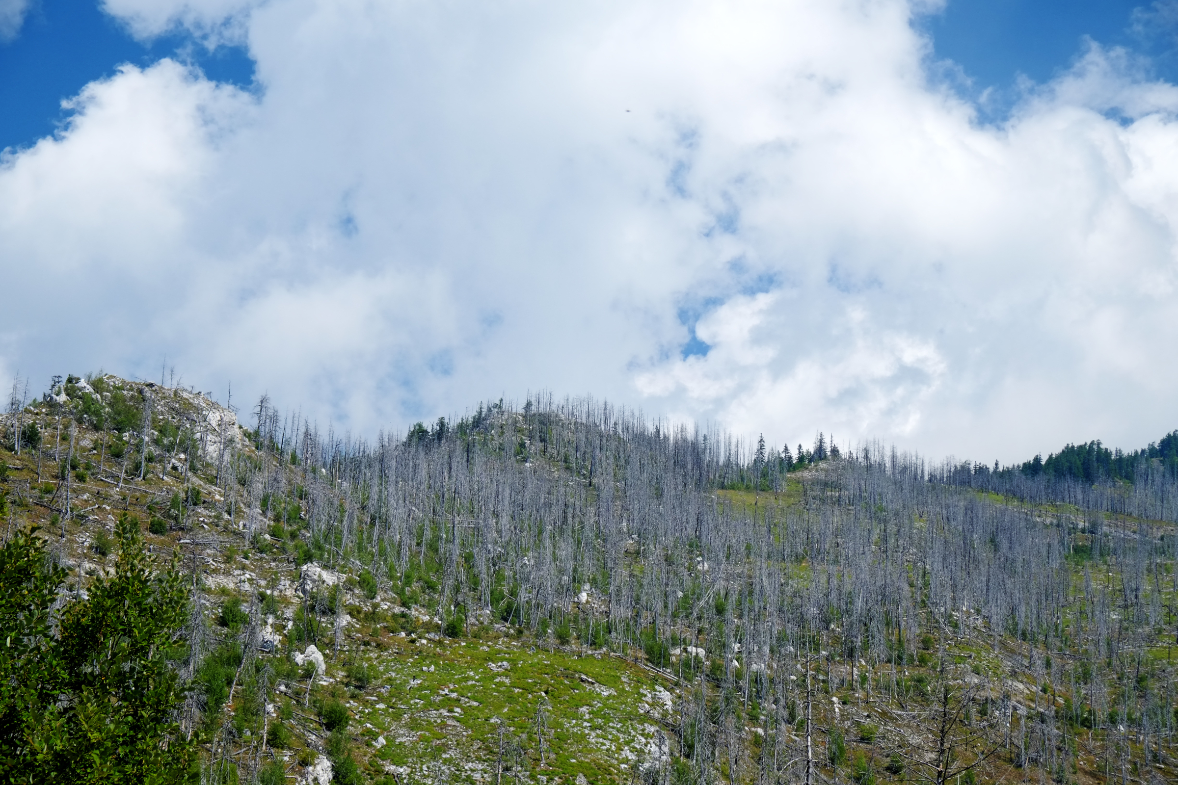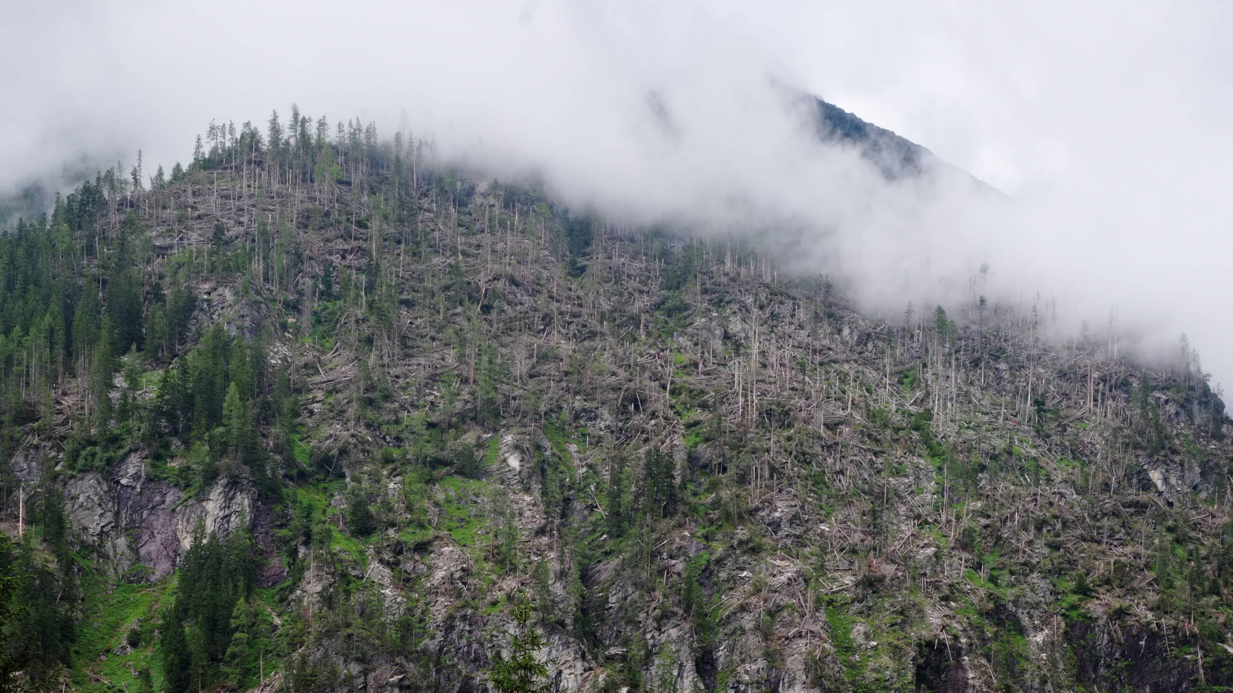Gebirgswälder können Lawinen und Erdrutsche verhindern, Steinschläge abfangen und vor Hochwasser schützen. Diese Schutzfunktion wird immer wichtiger, da Extremereignisse durch den Klimawandel häufiger werden. Gleichzeitig könnte aber auch die Schutzfunktion der Wälder durch eine Zunahme von Windwurf, Borkenkäferbefall und Waldbränden herabgesetzt werden (Moos et al. 2023). Solche Störungen treten in den letzten Jahrzehnten immer häufiger auf, wobei nicht alle Wälder gleichermaßen betroffen sind. Die Gefährdung der Wälder gegenüber Wind oder Feuer kann aufgrund der Topografie in Gebirgslandschaften stark variieren. Zudem hängen die Auswirkungen einer Störung auf den Schutzwald stark von der Vulnerabilität des Waldes ab, das heißt der Frage, wie stark die Schutzfunktion durch die Störung beeinträchtigt wird und wie schnell sie danach wiederhergestellt wird.