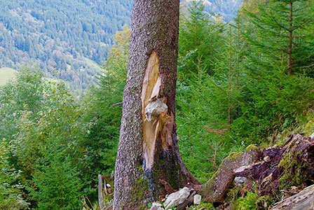 - Wird ein funktionsfähiger Schutzwald durch einen Sturm geworfen, geht die Schutzwirkung gegen Lawinenanrisse und Steinschlag vorerst nicht verloren, sondern verbessert sogar noch, da auf einer ungeräumten Fläche die zahlreichen Oberflächenstrukturen aus Holz verdämmend wirken.