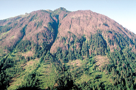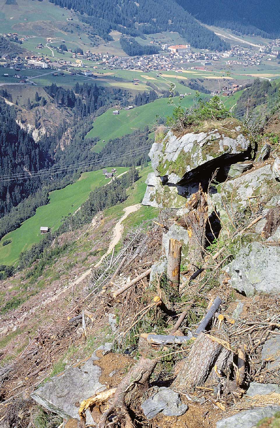 Der Sturm "Vivian" hat im Februar 1990 vor allem Gebirgswälder betroffen, viele davon waren Schutzwälder. Da Lawinenanrisse und Steinschlag stark von der Oberflächenrauhigkeit beeinflusst werden, erschien nach "Vivian" die Annahme plausibel, dass liegen gelassenes Holz auf ungeräumten Windwurfflächen Lawinenanrisse und Steinschlag besser verhindert als die spärlichen Holzreste auf einer geräumten Fläche. Die vielen Strukturen aus Holz erhöhen nämlich die Oberflächenrauhigkeit stark: Je dichter und höher der Verhau aus lebenden Bäumen, Totholzständern, Baumstümpfen, Wurzeltellern und liegenden Stämmen ist, desto wirksamer dämpft oder verhindert er Steinschlag und Lawinen (Abb. 1).
