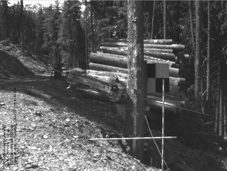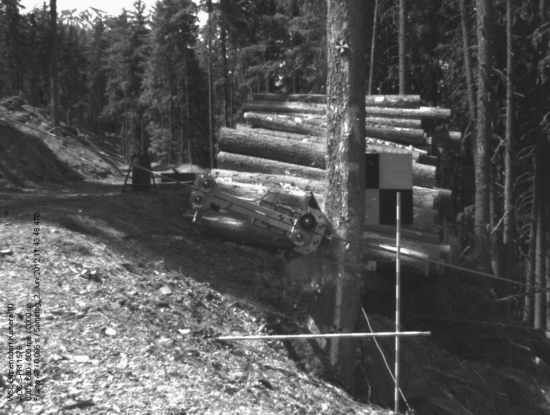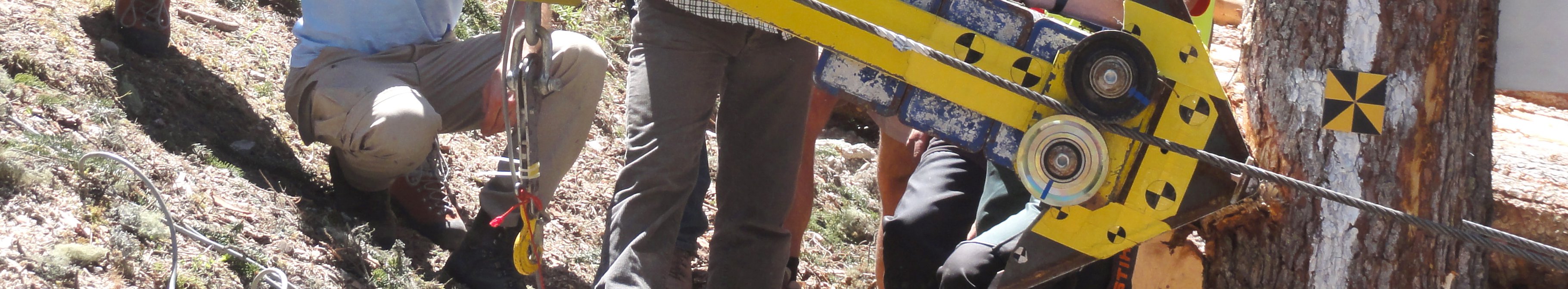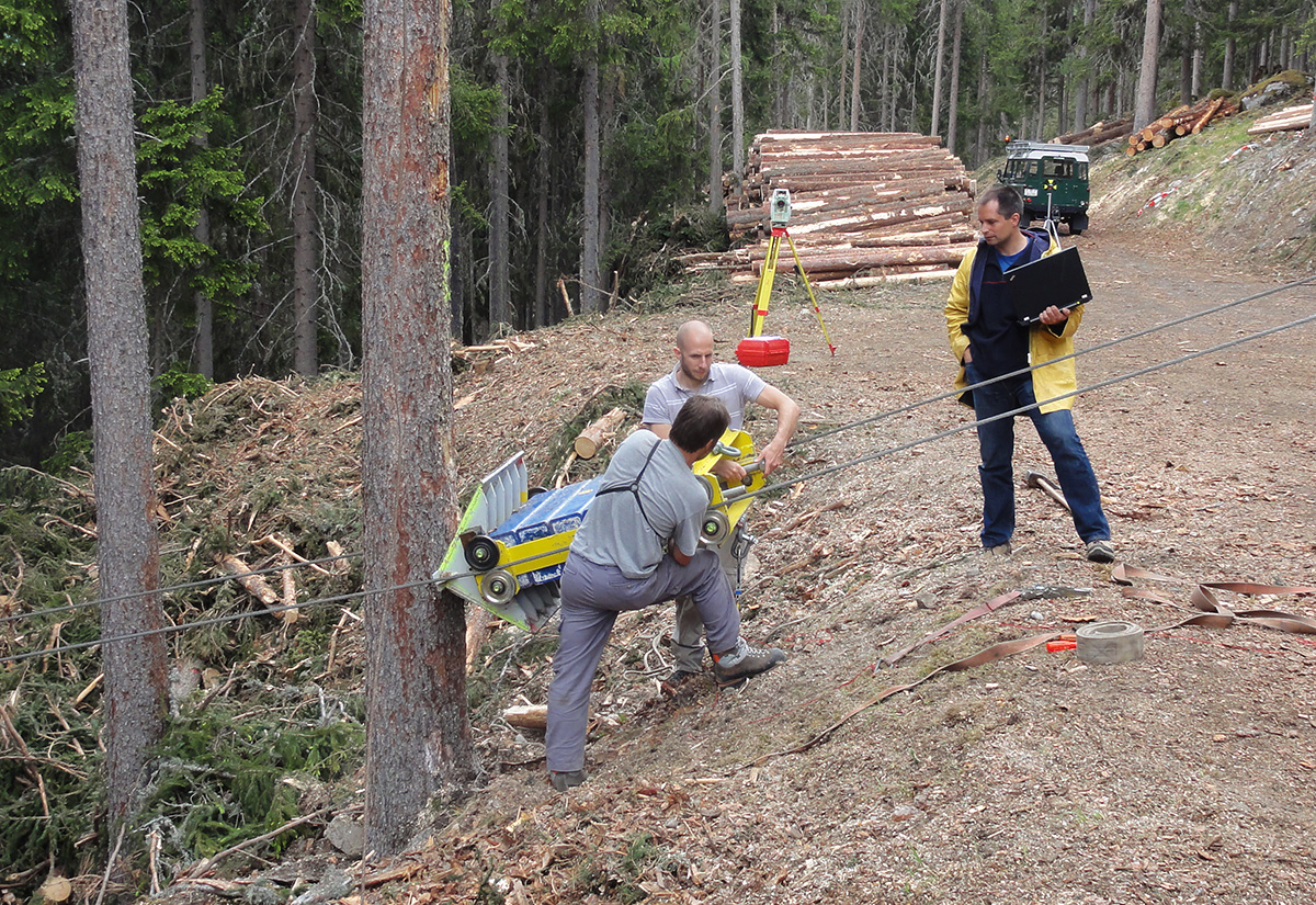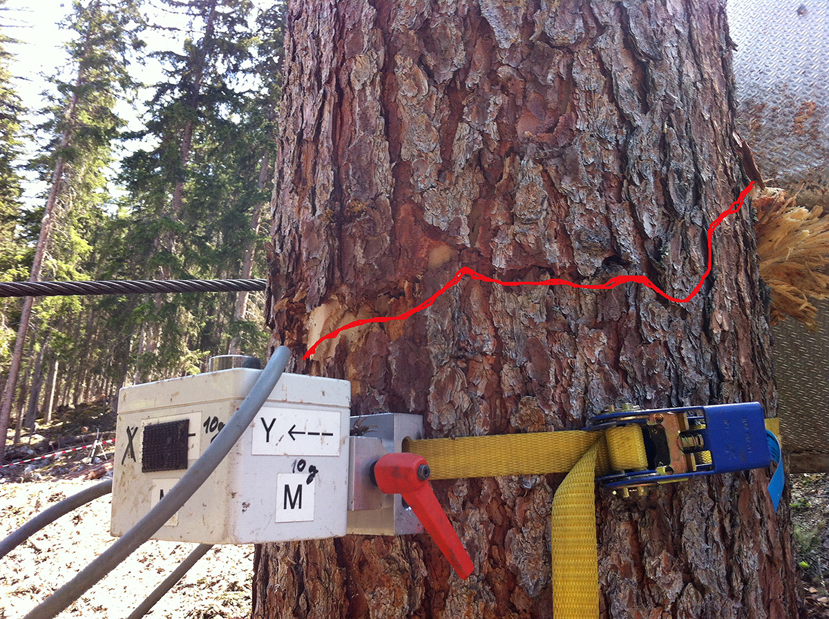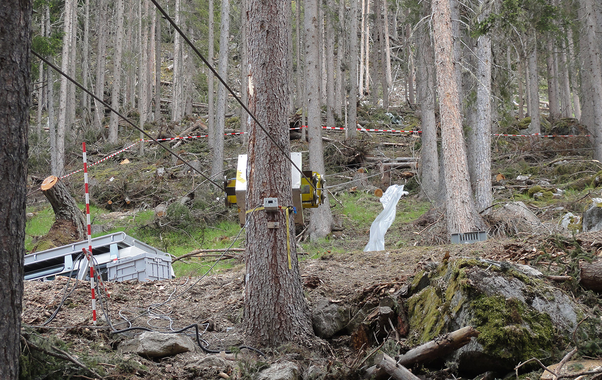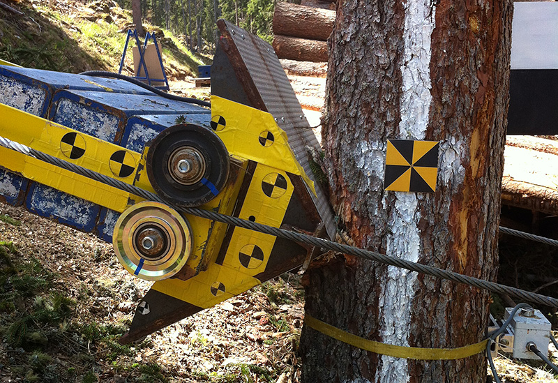 Im nächsten Schritt wurde vom Münstertaler Förster Jörg Clavadetscher und seinem Waldarbeiterteam die Seilbahn für den Wagen installiert. Im Wesentlichen braucht man hierfür zwei zueinander parallele Seile, die den Testbaum zu beiden Seiten passieren (Abb. 3). An diesen wird dann der Anprallwagen angehängt. Wenn das untere Ende der Seilbahn in der Höhe variabel installiert ist, kann die Anprallhöhe des Wagens am Baum präzise eingestellt werden. Der Wagen wird entlang der Führungsseile mit einer Seilwinde zur Startposition gezogen.