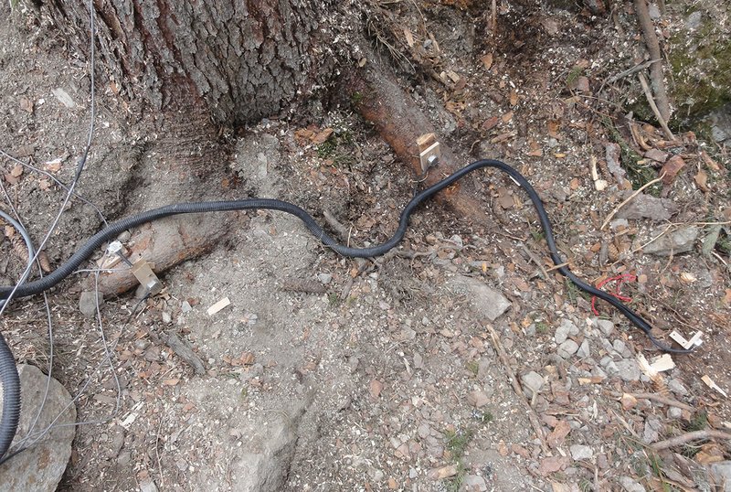 Vor dem Test wird auch die Messtechnik installiert. Hauptelemente sind die Beschleunigungsmessungen am Wagen, am Baumstamm und an (teilweise freigelegten) Hauptwurzeln (Abb. 4). Parallel dazu filmt eine Hochgeschwindigkeitskamera den Abbremsprozess mit 500 Bildern pro Sekunde. Eine zweite derartige Kamera ist auf den Wurzelballen gerichtet. Vor und nach dem Versuch wird zudem das gesamte Setup mit einem Vermessungsgerät (Tachymeter) erfasst.