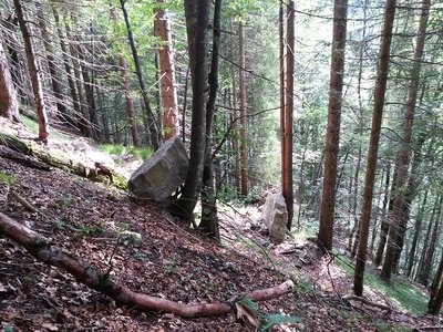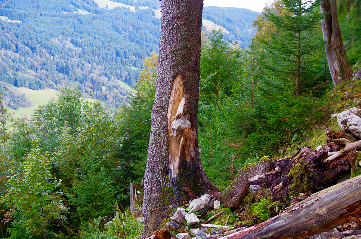 Nur ein Beispiel für die Wichtigkeit von Schutzwäldern ist das Sturzereignis Anfang Juli 2017 auf der Bundesstraße B305 in der Ramsau (Berchtesgadener Land). Dabei verfehlten mehrere Kubikmeter große Blöcke nur knapp ein Fahrzeug und führten zur zeitweisen vollständigen Sperrung der Bundesstraße. Hinweise auf eine mögliche Gefährdung durch Sturzprozesse im Bayerischen Alpenraum geben Gefahrenhinweiskarten, wie sie jedoch nicht für alle Alpenländer existieren. Aber welche Bestände schützen wie gut vor Steinschlag. Um dies zu ermitteln, müssen detaillierte Daten zum Bestandesaufbau der Schutzwälder erhoben werden. Die LWF testet im Projekt "RockTheAlps" das terrestrische Laserscanning im steilen Bergwald als präzise Erhebungsmethode für komplexe Waldstrukturen.