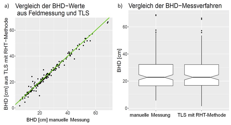 Abb. 7: Vergleich der BHD-Werte aus manueller Messung und TLS-Daten (a: Streudiagramm, b: Boxplots)