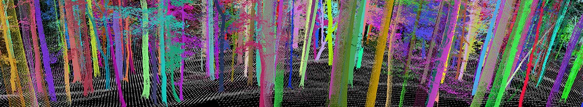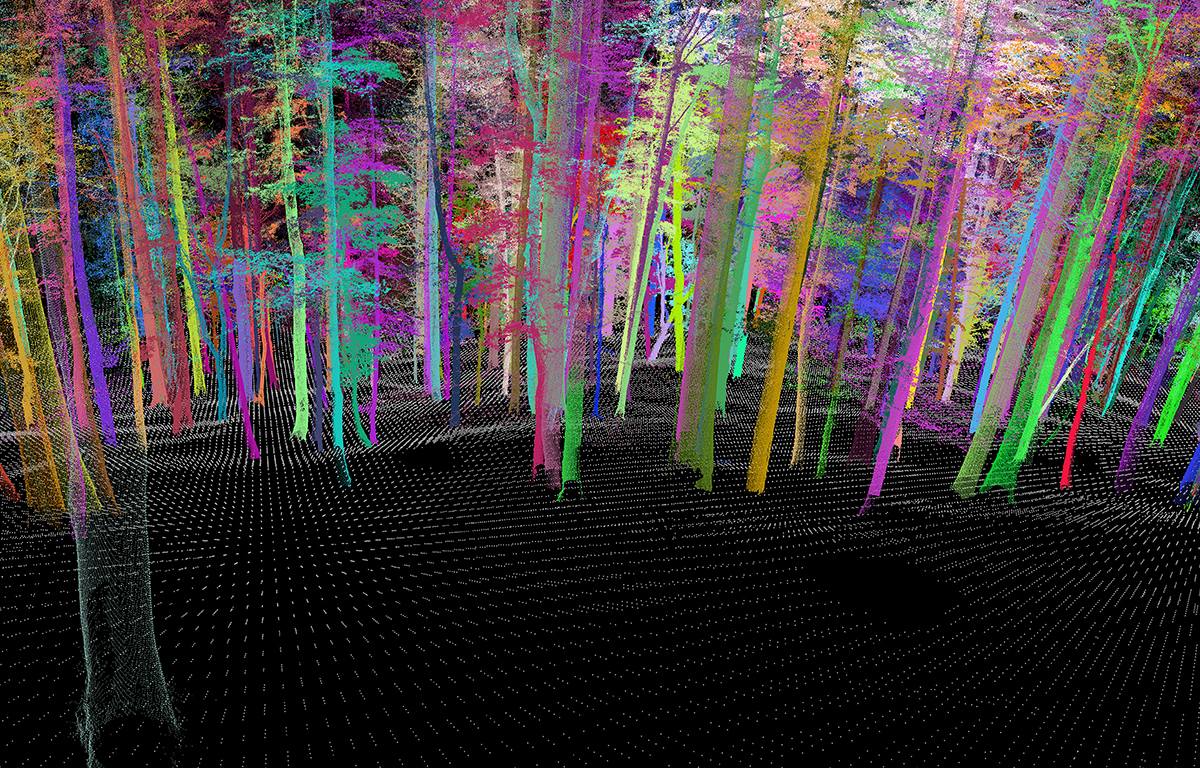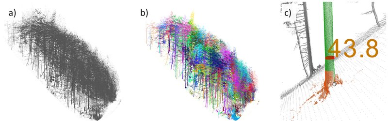 Abb. 5: Links die Punktwolke eines Waldbestandes in grau; mittig die Punktwolke mit individuell eingefärbten Bäumen; rechts ein gescannter Baum mit zugehörigem BHD (Quelle: LWF).