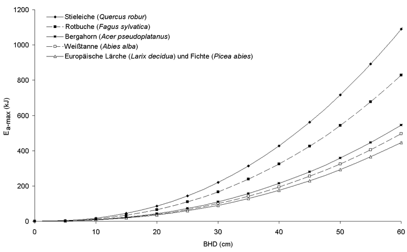 Darüber hinaus stellte man im Verlauf der Versuche fest, dass einzelne Baumarten mit gleichem BHD unterschiedliche Energiemengen aufnehmen können.
