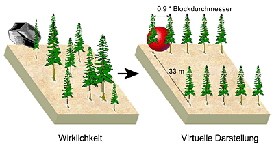 Das kostenlose und öffentlich zugängliche Programm RockForNET auf der Internetseite www.rockfor.net erlaubt jedem Benutzer, die wahrscheinliche Steinschlaggefahr am Fuße eines Steinschlag-Schutzwaldes zu berechnen. Das Programm wandelt die bestehende Waldstruktur in virtuelle Reihen nebeneinander stehender Bäume um. Hierbei beträgt der Abstand zwischen zwei Bäumen in einer Reihe 90 % des mittleren Steindurchmessers und der Abstand zwischen zwei Reihen 33 m (Abb. 3). Diese Distanz wurde von der mittleren baumfreien Strecke auf unserem Testgelände abgeleitet (Dorren et al. 2005). Die Wirksamkeit der Reihe wird bestimmt von der Baumart und den gleichen mittleren BHD der Bäume einer Reihe.