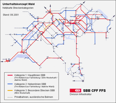 Damit diesen Mengenzunahmen auch die Leistungsqualität, zum Beispiel die Pünktlichkeit, zu folgen vermag, sind die Standards der Infrastrukturanlagen anzupassen. Das gilt auch für den Sicherheitsstreifen, welcher jenen Bereich neben den Gleisen definiert, aus dem durch Bäume oder Gehölzteile Gefahren für den Bahnbetrieb und die Bahnanlagen entstehen können. Das Waldpflegekonzept beruht darauf, in diesem Sicherheitsstreifen einen gesunden Wald- und Baumbestand mittels individueller Beurteilung der Stabilität und durch rechtzeitige sowie regelmässige Pflege zu erreichen. Auf Grund des unterschiedlichen Schadenpotenzials und eines differenzierten Sicherheitsbedürfnisses wurde das gesamte Streckennetz der SBB hinsichtlich verkehrspolitischer Bedeutung und der Belastung klassiert und in drei Streckenkategorien eingeteilt (vgl. Abb. 2):