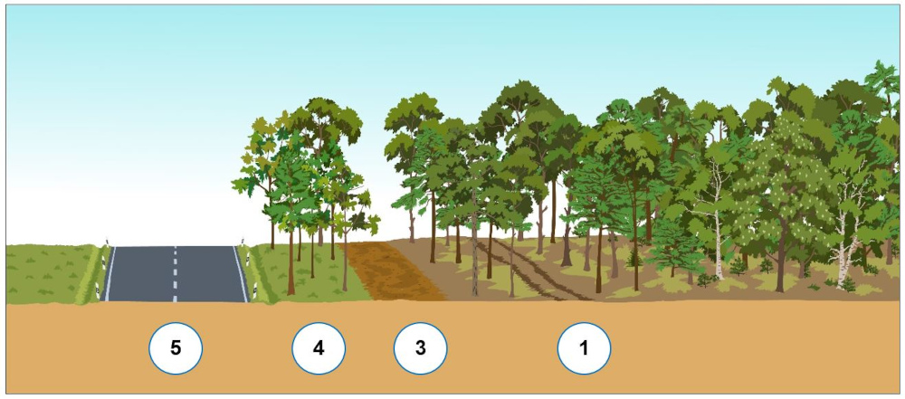 1 = angrenzender Wald in einem zweckerfüllenden Pflegezustand auf den ersten (mindestens) 30 m, unterstützt durch eine parallel laufende Arbeitsgasse, 3 = Wundstreifen (2 m breit), 4 = Schutzstreifen, 5 = Straße mit gepflegten Banketten (aus MÜLLER und JORDAN-FRAGSTEIN 2024)