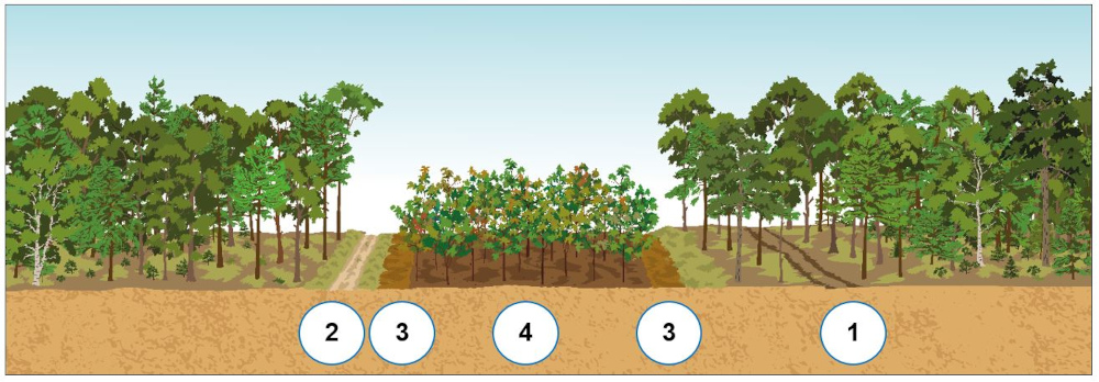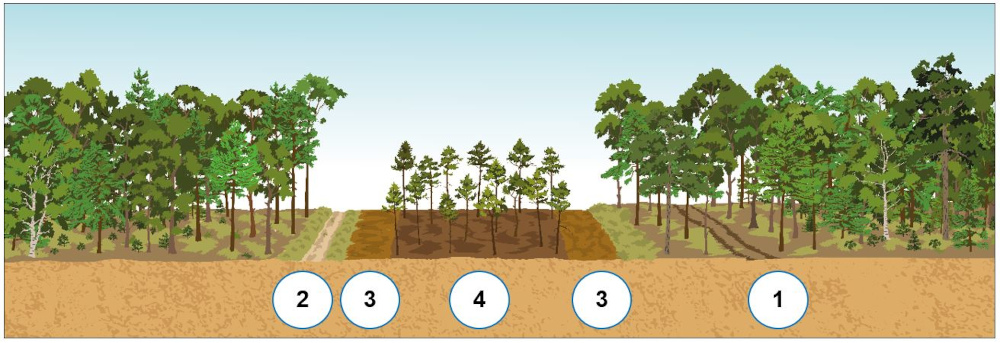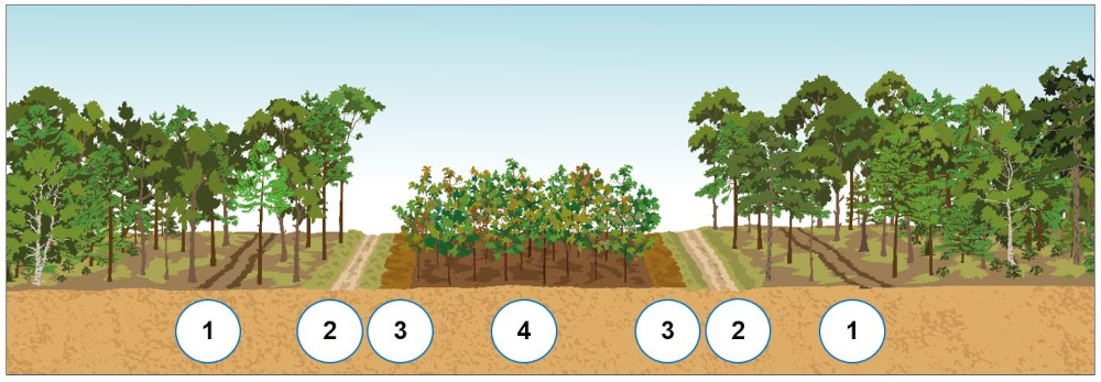 1 = angrenzender Wald mit besonders gutem Pflegezustand auf den ersten 30 m, unterstützt durch parallellaufende Arbeitsgasse, 2 = Waldbrandschutzweg mit beidseitigen Banketten und Rändern, 3 = Wundstreifen (2 m breit), 4 = Schutzstreifen / Riegelwald mit Gemeiner Kiefer (mindestens 20 m breit)