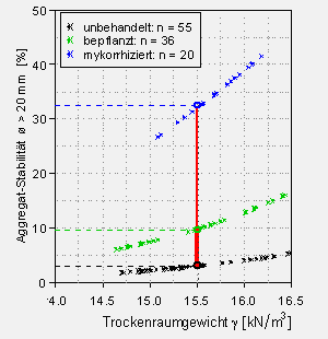 Abb. 4 - Aggregatstabilität in Abhängigkeit des Trockenraumgewichtes (Bodendichte) von unbehandeltem, bepflanztem und mykorrhiziertem Bodenmaterial. Nach sechsmonatiger Wachstumsphase resultiert in einem mittleren Bereich von 15.5 kN/m3 eine Verdreifachung der Stabilität von unbehandelt zu bepflanzt zu mykorrhiziert.