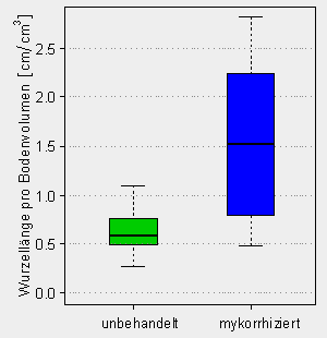 Abb. 3 - Bewurzelung von unbehandelten und mykorrhizierten Weisserlenpflänzchen (Alnus incana). Nach einer sechsmonatigen Wachstumsphase besitzen mykorrhizierte Pflanzen ein ca. dreimal längeres Wurzelwerk.