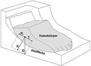 Erdrutsche sind mit freiem Auge wahrnehmbare Gleitbewegungen von Lockermassen entlang von Gleitflächen. Die Materialverlagerung erfolgt überwiegend aufgrund der Schwerkraft. Der Widerstand, den Böden jeder Bewegung entgegenbringen, setzt sich aus der inneren Reibung (Rf) und der Haftung (N) zusammen. Demgegenüber steht die treibende Kraft (T), die im Wesentlichen aus dem Eigengewicht (Schwerkraft) in Verbindung mit der Hangneigung resultiert.