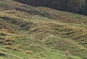 Abb. 4: Das unregelmäßige Gelände lässt erahnen, dass die Almfläche immer wieder von Rutschungen und Hangmuren betroffen ist (Laternsertal, Vorarlberg)