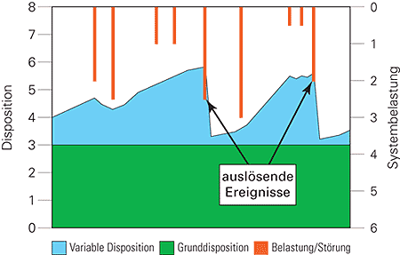 Prinzipiell wird zwischen Grunddisposition und variabler Disposition eines Gebietes unterschieden (Rutschungsauslösung siehe Abbildung 3). Während die Grunddispositionen über längere Zeiträume weitgehend gleich bleibt (wie etwa Hangneigung), schwankt die variable Disposition (beispielsweise Vegetationseinfluss). Zusammen entscheiden sie, welche Belastungen (meist extreme Niederschlagsmengen) der Hang aufnehmen kann, bevor er ins Rutschen gerät.