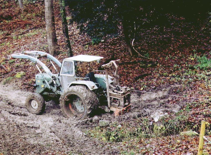 Die Versuchsanordnung entsprach den oben dargestellten Modellvorstellungen. Zunächst trennten die Forscher die Verbindungsnägel zwischen den Rundhölzern durch, um die Bauteile ohne den Einfluss vertikaler Verbindungen prüfen zu können. Die Einwirkung auf jedes Rundholz wurde mit einem Drahtseil als Einzellast in der Mitte eingeleitet (Abb. 2c). Dadurch ergab sich - analog zum Bemessungsmodell - das maximale Feldmoment in Balkenmitte zu Mmax = Q·L/4. Die Länge L berechneten die Wissenschafter nach der Formel L = L’+1⁄2(T1+T2), wobei sie die sichtbare Länge L’ vor und die horizontalen Einbindetiefen T1 bzw. T2 nach dem Versuch massen (vgl. Abb. 2a). Mit einer traktorbetriebenen Seilwinde wurden die einzelnen Rundhölzer der Sperren auf Biegung bis zum Bruch belastet (Abb. 3).