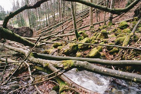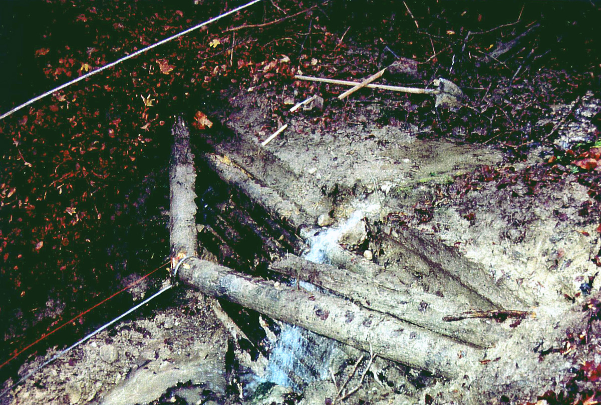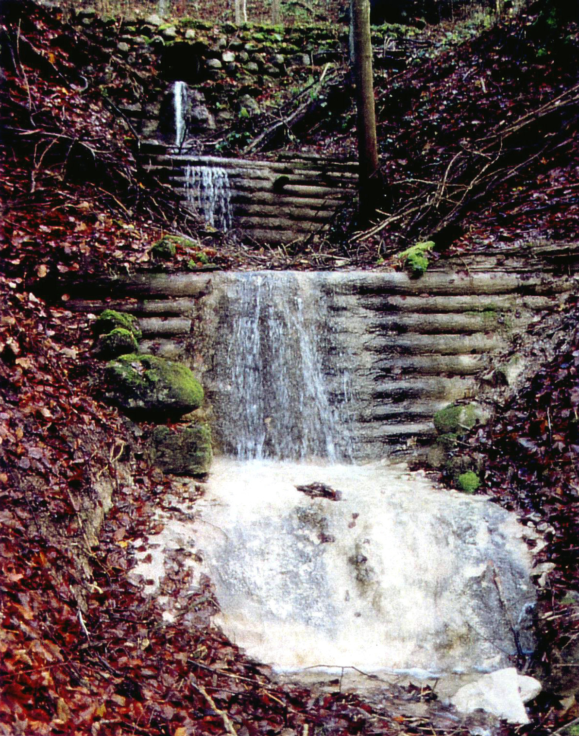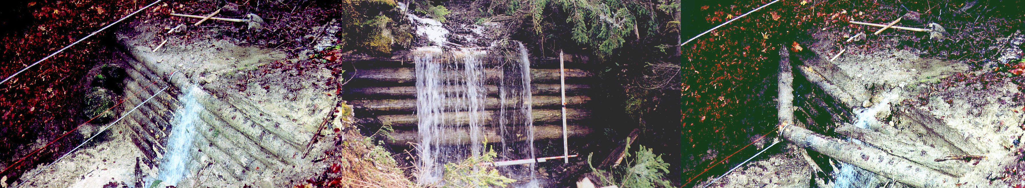 Die Untersuchung wurde in einem vollständig beschatteten Gerinne am Westhang des Zimmerbergs durchgeführt (Gemeinde Hirzel, Kanton Zürich). Die einwandigen Wildbachsperren aus Fichten- und Tannenholz stammen gemäss Angaben des lokalen Forstdienstes aus den Jahren 1939 bis 1945. Der Forstdienst schätzte zum Zeitpunkt der Untersuchung im Herbst 2000 die ganze Verbauung als sanierungsbedürftig ein, und es war geplant, sie im Jahr 2001 zu ersetzen. Für die Untersuchung wählten die Wissenschafter drei Sperren auf rund 650 m ü.M. aus (Abb. 1).