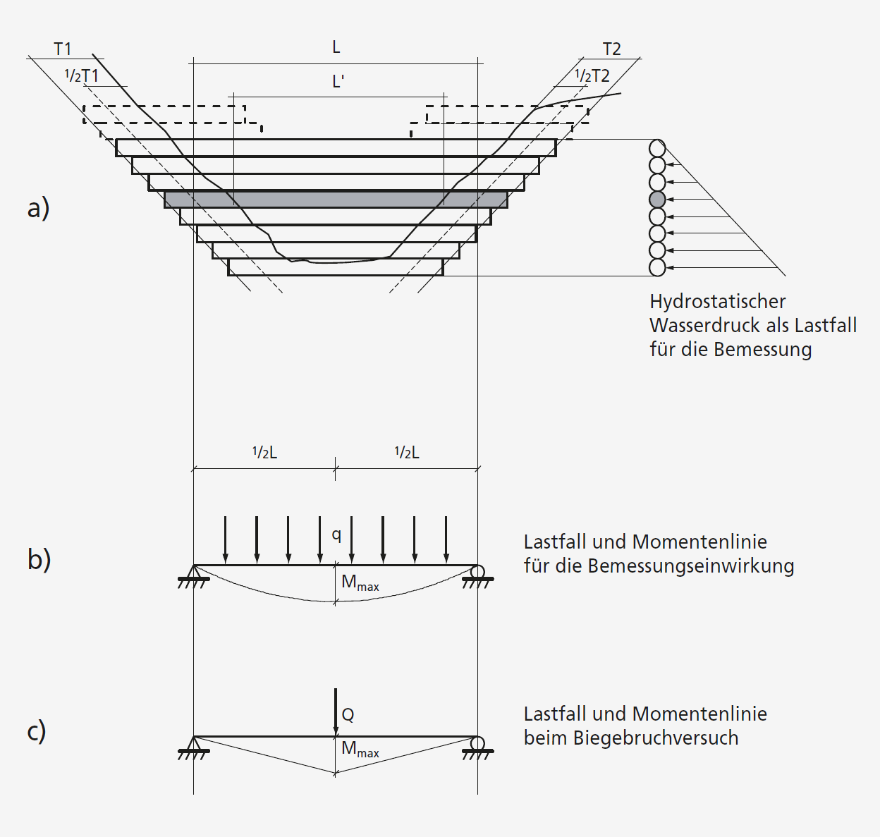 Das statische System für ein verbautes Rundholz entspricht in erster Näherung einem einfachen Balken (Abb. 2b). Die ideellen Auflager werden in halber Einbindungstiefe angenommen. Aus diesem statischen Modell resultiert ein maximales Biegemoment Mmax = q·L2/8 in Balkenmitte, wobei q die aus dem hydrostatischen Wasserdruck resultierende Linienlast und L die Länge des Rundholzes zwischen den ideellen Auflagern ist.
