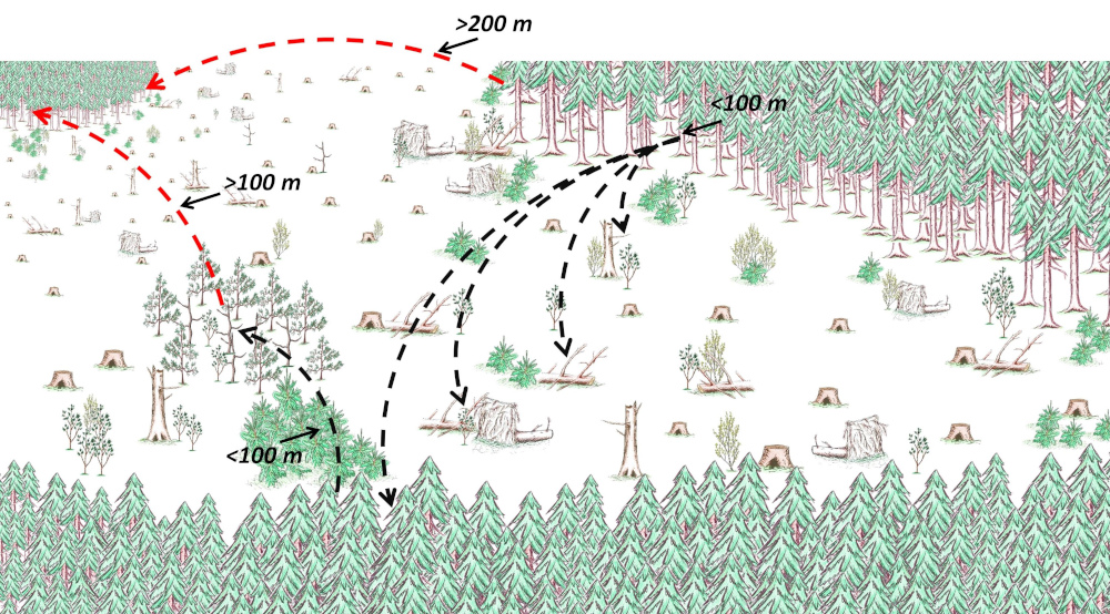 Ebereschensamen werden von fruchtfressenden Singvögel auf Freiflächen bis zu 100 m verbreitet. Diese nutzen die Strukturelemente auf Freiflächen als Rast- und Sitzgelegenheiten (Sichtschutz) zum Absetzen von Kot (McDonnell und Stiles 1983, Żywiec et al. 2013). Bevorzugt werden dabei vor allem stehende, stärker dimensionierte und mindestens einen Meter hohe Totholzelemente, wie Hochstubben, umgeklappte Wurzelteller, aufragende Steiläste und weniger bereits etablierte Naturverjüngung oder künstliche Elemente (Zaun, Einzelschutz) (Tiebel et al. 2017). Größere Distanzen werden jedoch von den Vögeln überflogen, unabhängig davon ob Strukturelemente oder attraktive Nahrung vorhanden ist (McDonnell und Stiles 1983, Tiebel et al. 2017).
