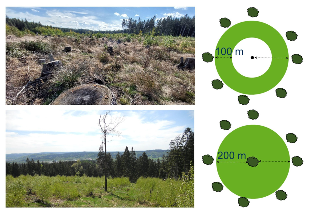 Entscheidend für den Erfolg oder das Ausbleiben von Naturverjüngung aller Pionierbaumarten und der Wiederbewaldungsgeschwindigkeit sind ebenfalls Schadflächengröße und -form. Bei mehr oder weniger runden Schadflächen von mehr als vier Hektar Größe muss ebenfalls davon ausgegangen werden, dass sich erst nach mehr als fünf bis 15 Jahren das Zentrum mit diesen Pionierbaumarten zu schließen beginnt (Tiebel 2020). Denn die Wiederbewaldung kann nur durch Naturverjüngung am Freiflächenrand nach Eintritt in das reproduktionsfähige Alter übernommen werden. Im Zentrum kann über den langen Zeitraum bereits eine Vergrasung eingetreten sein, sodass sich die Wiederbewaldung dieses Bereiches deutlich länger hinzieht als am Schadflächenrand.
