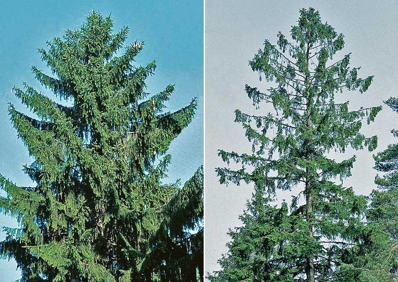 Abb. 1: Schätzung des Nadelverlusts bei der Baumart Fichte. links: 10% Nadelverlust, rechts: 65% Nadelverlust (Foto: AG Kronenzustand, 2007).