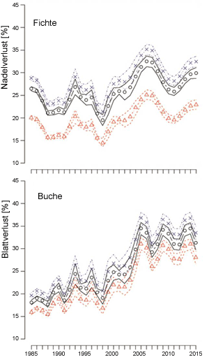 Da mittlerweile mit gleichbleibenden Methoden Kronenzustandserfassungen seit Mitte der 1980er Jahre durchgeführt wurden, kann man jetzt die knapp 30-jährige Zeitreihe im Überblick interpretieren (Abb. 2). Die Zeitreihen wurden um Alterseffekte und regionale Effekte wie Regionalklima und Geologie bedingte Unterschiede bereinigt für die beiden Hauptbaumarten Buche und Fichte dargestellt. Für beide Baumarten ist in der bisherigen Aufnahmeperiode der Waldschadensinventur ein ansteigender Trend der Nadel-/Blattverluste festzustellen. In der Entwicklung der Kronenschäden über die Jahre ergeben sich jedoch deutliche Unterschiede. Während die Fichte zu Beginn der Erhebungsperiode gegenüber der Buche ein erhöhtes Schadniveau aufweist und der weitere Verlauf etwa bis zur Jahrtausendwende durch ein gleichbleibendes Niveau mit periodischen Schwankungen im Zehnjahresrhythmus gekennzeichnet ist, sind bei der Buche in der ersten Hälfte der Erhebungsperiode geringere Kronenschäden zu beobachten, die in deutlich kürzeren Abständen schwanken. Zu Beginn des neuen Jahrtausends nimmt der Schädigungsgrad der Baumkronen sowohl bei der Fichte als auch bei der Buche signifikant zu. Seither pendeln die Nadel-/Blattverluste wieder in den zuvor beobachteten Perioden weiter, jedoch nun auf einem erhöhten Schadniveau.