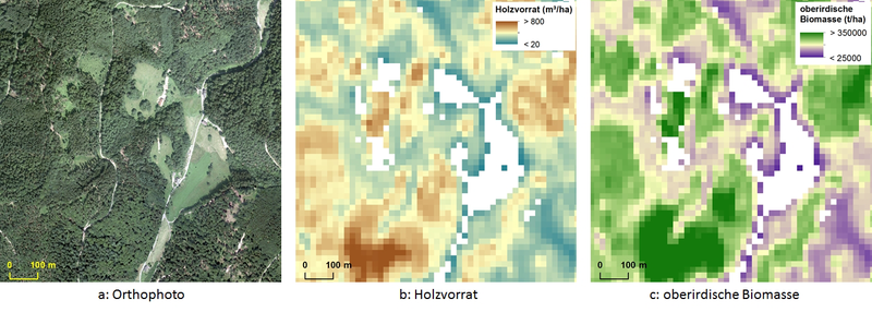 Abb. 3: Beispielkarten für Holzvorrat (b) und Biomasse (c). Das dazugehörige Orthophoto (a) wird zur Referenz angezeigt.