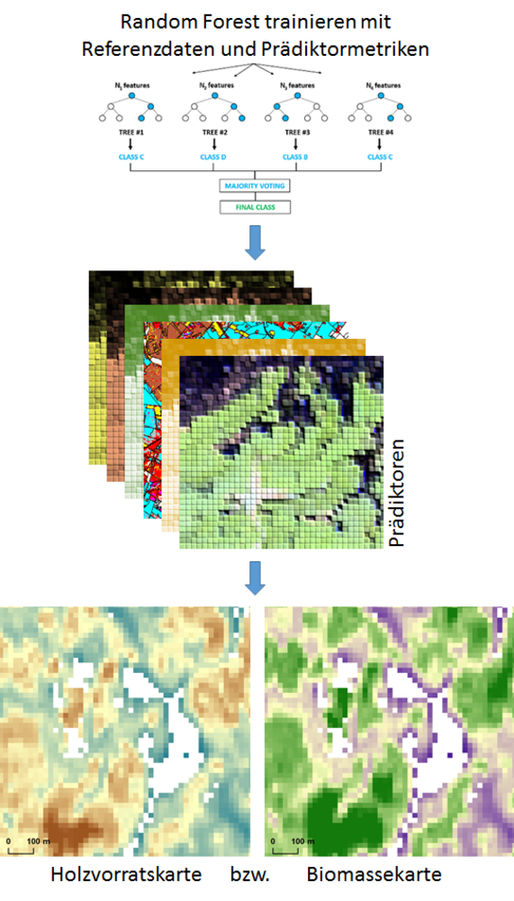 Abb. 2: Modellierung von Holzvorrat und oberirdischer Biomasse mit Random Forest.
