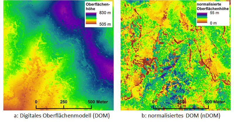 Abb. 2: Beispiele für ein digitales Oberflächenmodell (a) und ein normalisiertes digitales Oberflächenmodell (b) im Rasterformat.