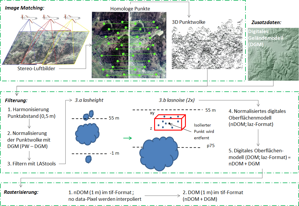 Aus Luftbildaufnahmen erzeugte 3D-Punktwolken sind nicht fehlerfrei. Während des Image Matchings kann es, z. B. in dunklen Bildbereichen, zu falschen Zuordnungen homologer Bildpunkte kommen, woraus fehlerhafte Höheninformationen einzelner 3D-Punkte resultieren. Um fehlerhafte Punkte bzw. Punktgruppen aus der Punktwolke zu entfernen, wurde ein mehrstufiges Filterverfahren implementiert, in dessen Zuge Punkte, die aufgrund ihres Höhenabstands zum Gelände oder ihrer isolierten Lage als fehlerhaft eingestuft werden können, aus der Punktwolke gelöscht werden. Ein hochgenaues, digitales Geländemodell (DGM) mit 1 m Auflösung wird hierzu benötigt. Geeignete laserscanningbasierte DGM können von den Vermessungsinstitutionen der Bundesländer bezogen werden. Im Rahmen der Filterung wird das DGM ebenfalls dazu verwendet die 3D-Punktwolke zu normalisieren, das heißt, die Geländehöhe von den Punkthöhen abzuziehen und so ein normalisiertes Oberflächenmodell (nDOM) zu erzeugen.