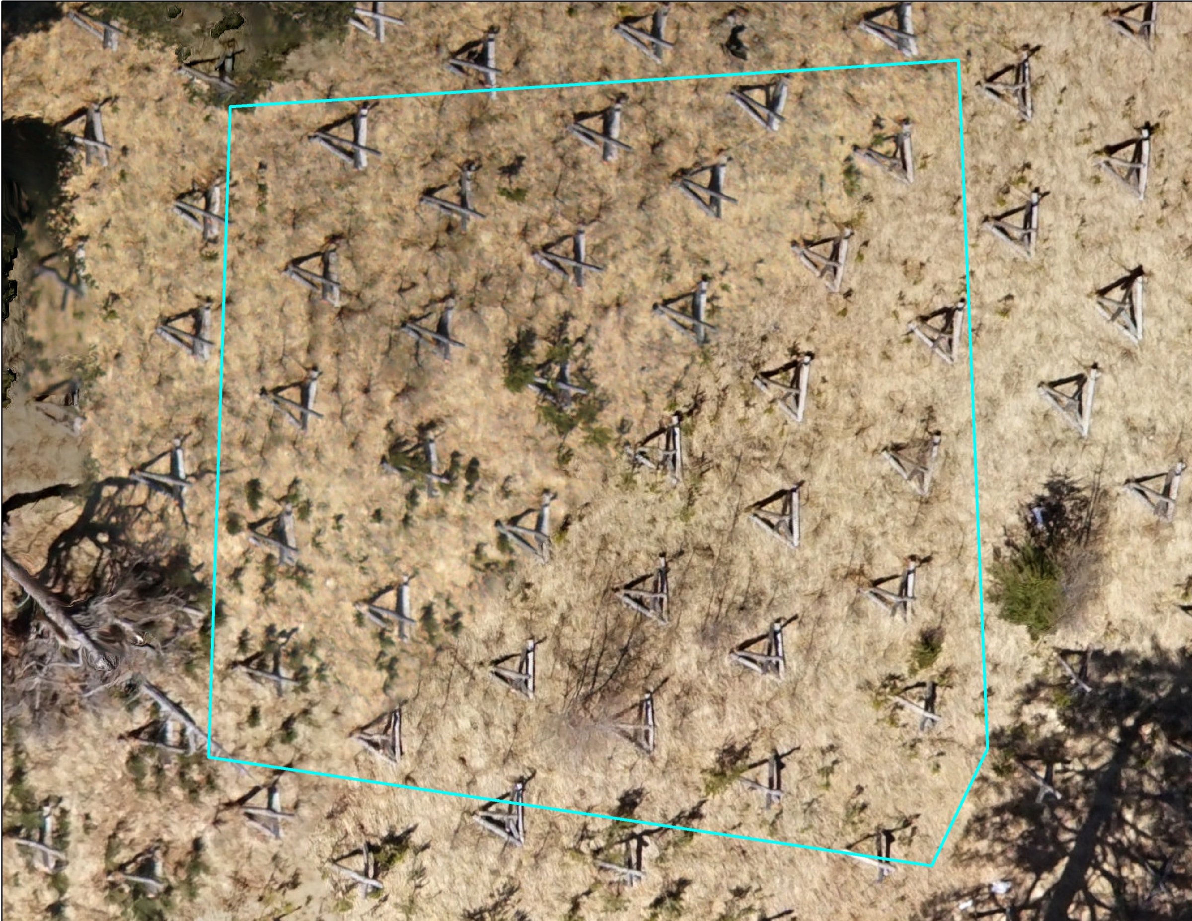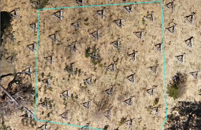 Abbildung 4 zeigt eine klassische Sanierungssituation: einen stark vergrasten steilen Südhang. Da die jungen Baumpflänzchen hier durch Schneebewegungen stark gefährdet sind, dienen Dreibeinböcke aus dauerhaftem Edelkastanienholz als Schutz für die in kleinen Trupps gepflanzten Bäume. Dennoch kommt es an solchen schwierigen Standorten immer wieder zu Ausfällen und es dauert oft mehrere Jahrzehnte, bis die verbleibenden Bäume selbst eine Schutzfunktion übernehmen. Ob Nachpflanzungen erforderlich sind, lässt sich sehr gut anhand des Luftbilds beurteilen. Mit derselben Methode wie im obigen Beispiel wurden auf einer Fläche von circa 340 m² 103 grüne Nadelbaumpflänzchen detektiert. Das entspricht rund 3.000 Pflanzen pro Hektar – an sich ein akzeptabler Wert, allerdings ragen die meisten Bäumchen gerade einmal 20 cm über das noch vom Schnee niedergedrückte Gras hinaus, nur vereinzelte Exemplare haben schon die 1-Meter-Marke überschritten.