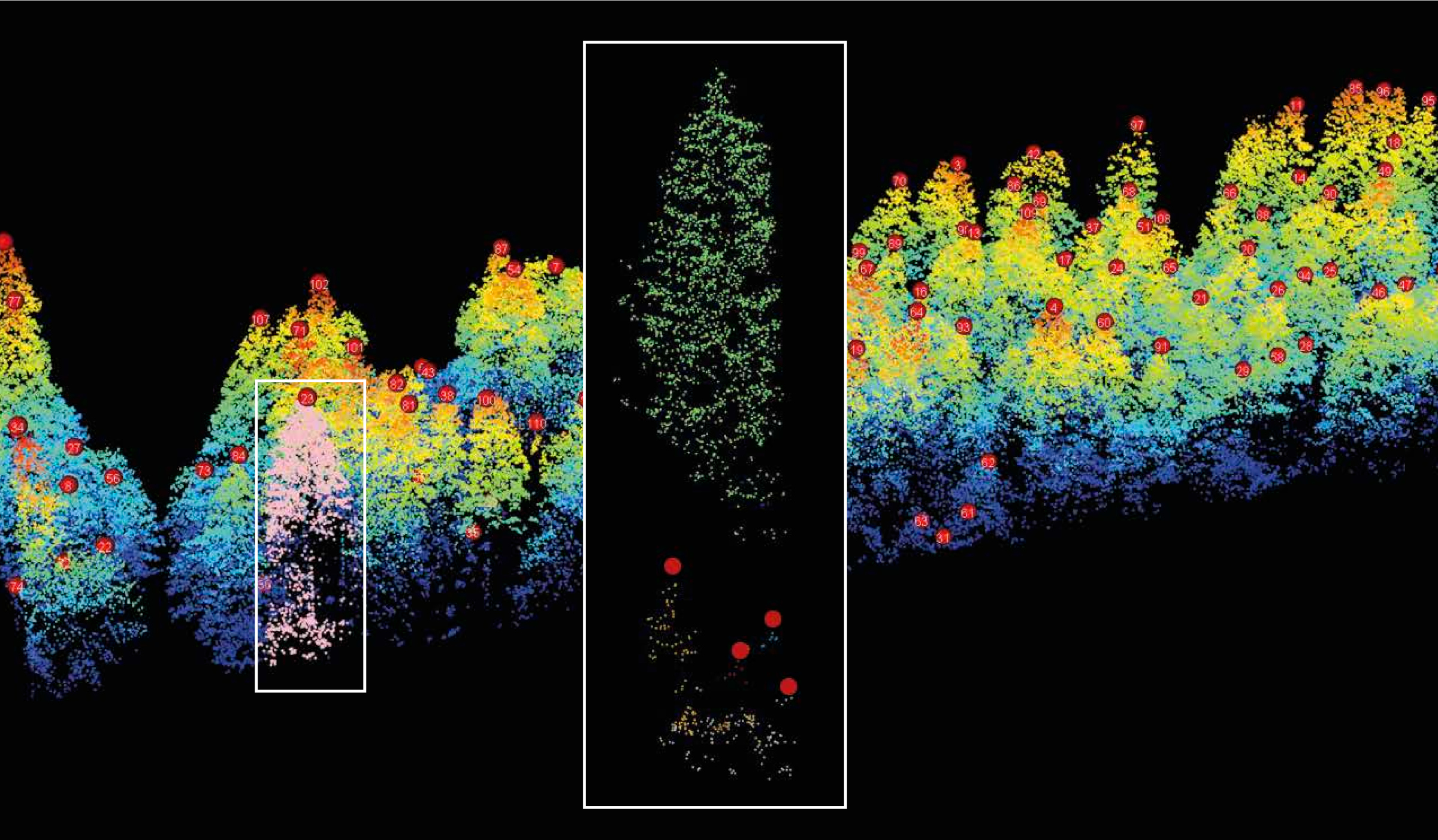 Ein großer Vorzug der Laser-basierten Fernerkundung (LIDAR) ist, dass sie auch einen Blick unter das Kronendach der älteren Bäume ermöglicht. Die aktiven Laserlichtpulse arbeiten gut im dunklen Schatten der Baumkronen und durch ihre große Anzahl erreichen immer ein paar die unteren Baumschichten und den Boden.