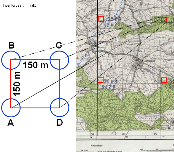 Primäre Stichprobeneinheit ist ein quadratischer Trakt mit 150 m Seitenlänge. Die Traktecken, die auf Wald treffen, bilden die Mittelpunkte für Unterstichproben, an denen eine Reihe verschiedener Aufnahmen durchgeführt wird (Abb. 1). Bei der BWI3 wurden im Land 13.232 Stichproben an den Ecken von insgesamt 4.580 Trakten aufgenommen. Das Landesterritorium wird von 8.970 Trakten im 2 mal 2 km Netz mit insgesamt 35.731 Traktecken abgedeckt. Bei einer Landesfläche von 3.575.148 ha ergibt sich je Stichprobe (Traktecke) ein Repräsentationsfaktor von 100,0573 ha.