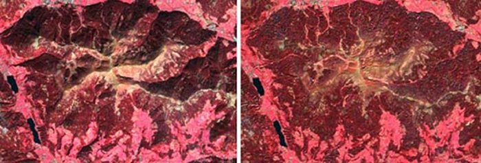 Abbildung 2: Farb-Infrarot-Darstellung des Originalbildes (links) und des radiometrisch korrigierten Bildes (rechts). Die Schatten sind aufgehellt, die besonnten Teile etwas abgedunkelt (Bereich Wöllaner Nock in Kärnten).