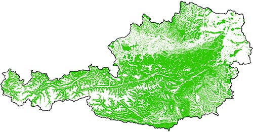 Mit Hilfe von Methoden der Fernerkundung wurde am Institut für Waldinventur des Bundesforschungs- und Ausbildungszentrums für Wald, Naturgefahren und Landschaft erstmals eine bundesweit flächendeckende satellitenbildbasierte Waldkarte unter Einbeziehung terrestrischer ÖWI-Daten produziert (Abbildung 1), die auch für kleinere Erhebungseinheiten gute Resultate liefert.