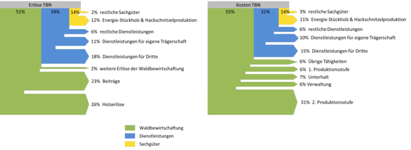- Dienstleistungen: Forstdiensttätigkeiten, Betreuung fremder Waldungen, Holzhandelsbetrieb, Dienstleistungen für Dritte, Dienstleistungen für eigene Trägerschaft, Lehrtätigkeit für Dritte, Waldschulen, Vorträge, Führungen, übrige Dienstleistungen.