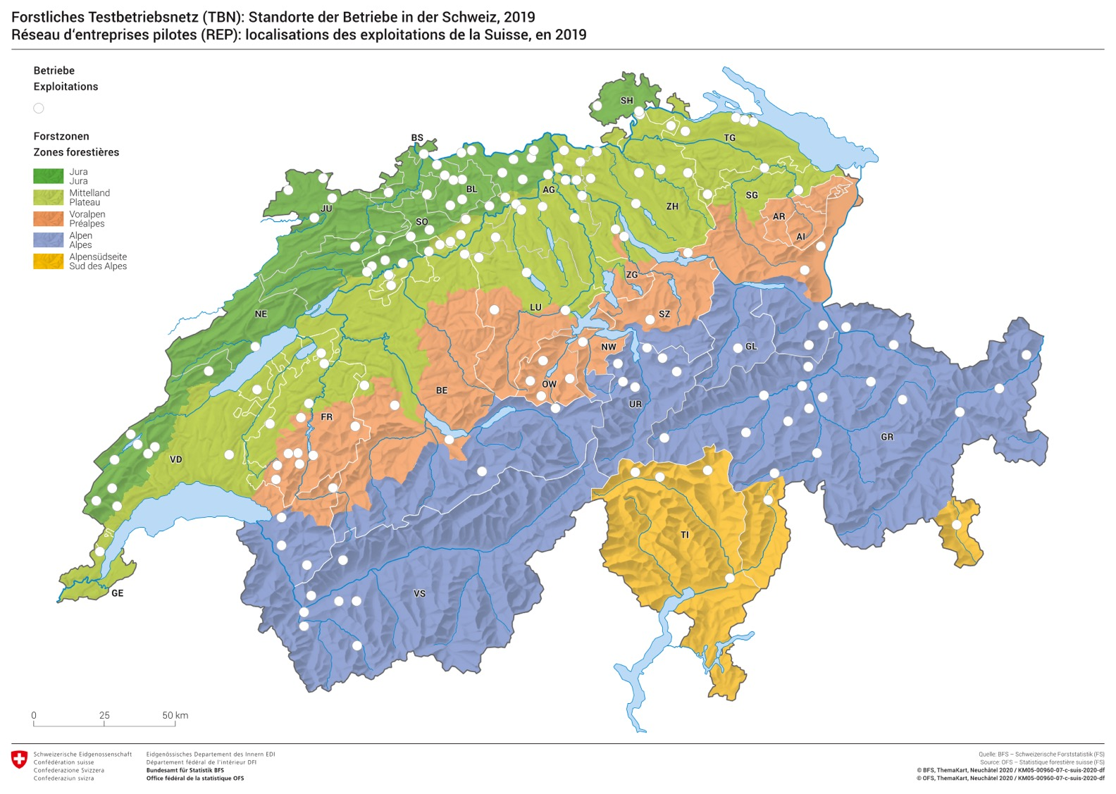 2019 wurden 43 Betriebe der Forstzone Jura, 47 dem Mittelland, 25 den Voralpen und 45 den Alpen zugeordnet.
