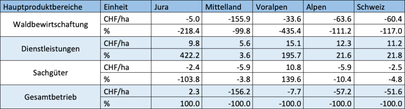 Bei den Hauptproduktbereichen zeigt sich ein ähnliches Bild. Gesamtschweizerisch ist einzig das Ergebnis der Dienstleistungen positiv (11 CHF/ha). Hauptverantwortlich dafür sind die Dienstleistungen für Dritte (z.B. Gartenholzernte). Mit der Sachgüterproduktion erzielen einzig die Voralpenbetriebe positive Ergebnisse. Sowohl im Schweizer Durchschnitt als auch auf Ebene der restlichen Forstzonen gelingt es den Betrieben nicht, Gewinne mit der Sachgüterproduktion zu erwirtschaften. Hauptgrund dafür ist die nicht rentable Energie-Stückholzproduktion (Tab. 3).