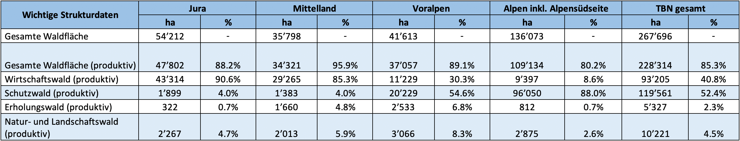 Die gesamte Waldfläche aller TBN-Betriebe beträgt rund 267'696 ha und entspricht 21% der Waldfläche der Schweiz (BFS 2020). Der Anteil der produktiven Waldfläche liegt bei 85% (Tab. 1). Die Vorrangfunktion Schutzwald hat mit gut 52% der produktiven Waldfläche flächenmässig die grösste Bedeutung, gefolgt vom Wirtschaftswald mit 41%. Der Erholungswald (2%) wie auch der Natur- und Landschaftswald (5%) haben flächenmässig eine geringere Bedeutung (Tab. 1). Der Hauptproduktionsbereich Waldbewirtschaftung ist in die vier Vorrangfunktionen Waldwirtschaft, Schutzwald, Erholungswald und Natur- und Landschaftswald unterteilt. Die Ausscheidung der Vorrangfunktion erfolgt anhand des Betriebs-, des Waldentwicklungsplans (WEP) oder nach einer gutachterlichen Zuteilung durch Betriebsleiter.