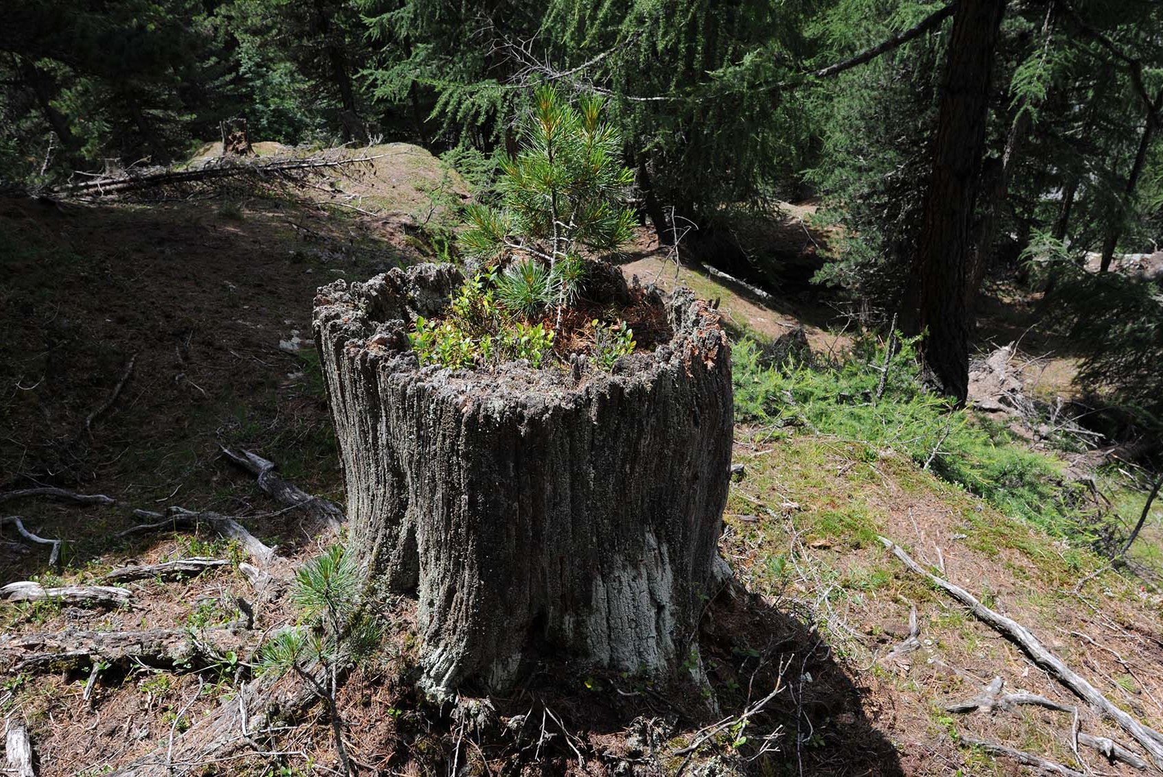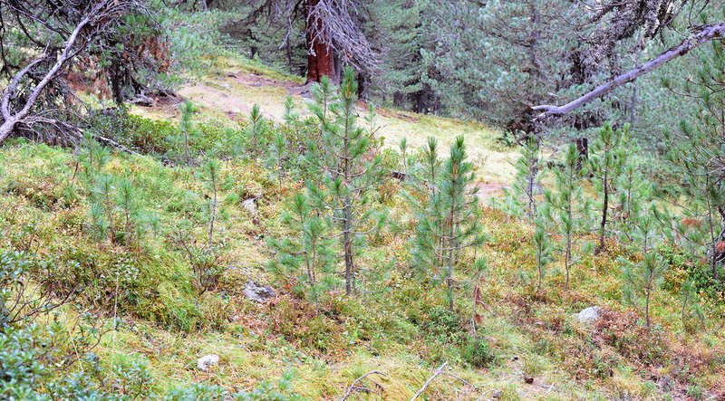 Im God da Tamangur hatte vor allem die alpwirtschaftliche Nutzung – Beweidung und Brennholzsammeln – einen Einfluss auf die Waldentwicklung. Nutzungsspuren durch Holzschlag sind kaum zu finden. Die Entwicklung der Stammzahlen von 1904 bis 2013 lässt erahnen, wie sich die Nutzung auf die Waldstruktur auswirkte: Nach Aufgabe der Beweidung nimmt die Stammzahl stark zu, die Verjüngung (Abb. 8) erholt sich – und somit auch der Wald insgesamt. Das nun liegen gelassene und heute bereits reichlich vorhandene Totholz bietet vielen teilweise bedrohten Organismen Lebensraum, und die hohe Dichte an wichtigen Habitatstrukturen wie Stammlöchern und Giganten trägt zum ökologischen Wert dieses Waldes bei. Allerdings zeigt die beeindruckende Zunahme von Stammzahl, Vorrat und Totholzvolumen auch, dass der God da Tamangur noch kein Urwald und schon gar nicht ein Urwald im Gleichgewicht ist.