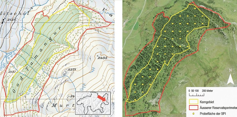 Der God da Tamangur in der Val S-charl (Unterengadin, Kanton Graubünden, Abb. 1) ist eines der 49 von WSL und ETH beobachteten Schweizer Naturwaldreservate (NWR). Hier fand im Sommer 2013 eine Stichprobeninventur (SPI) statt, dank welcher erstmalig ein repräsentatives Bild der Waldstruktur von Tamangur vorliegt.