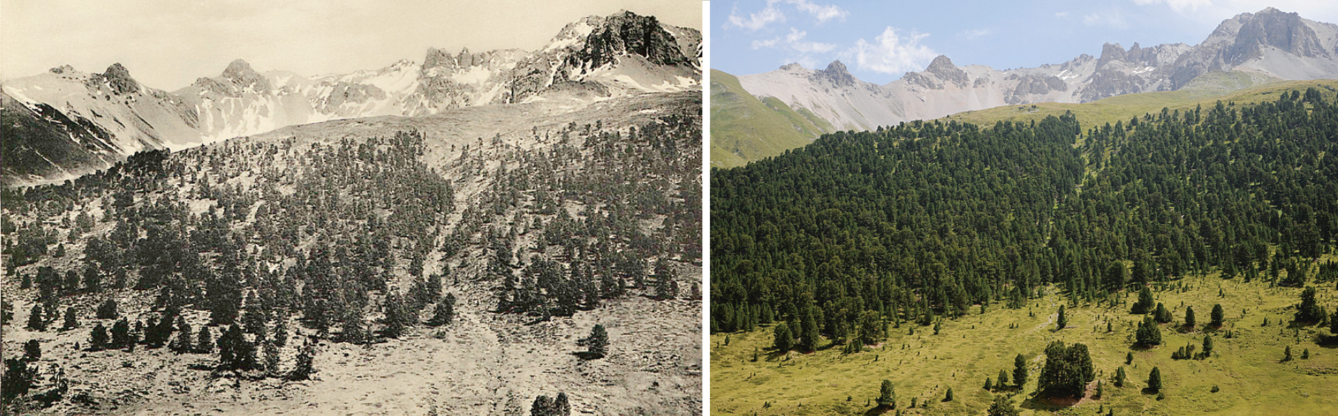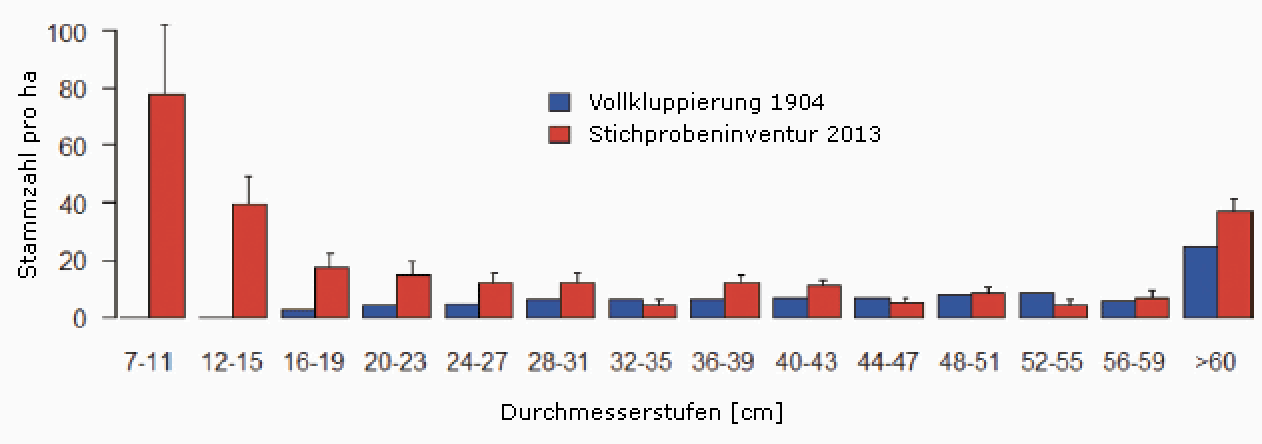 In den letzten 100 Jahren hat sich die Artenzusammensetzung kaum verändert, wie Gegenhangfotos zeigen (Abb. 4); der Wald ist jedoch deutlich dichter geworden und die Stammzahl hat sich fast verdoppelt (Abb. 5). Die Stammzahlzunahme durch Einwuchs führt heute zu einer deutlich grösseren Anzahl dünner Bäume (Abb. 6). Trotz dieser starken Stammzahlzunahme hat der Vorrat seit 1904 nur um einen Drittel zugenommen – es wächst sich langsam im subalpinen Wald, und die eingewachsenen kleinen Bäume tragen bisher nur wenig zum Vorrat bei (Abb. 5).