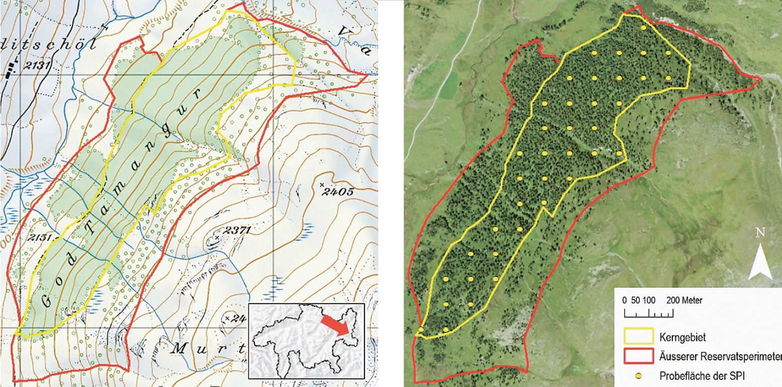 In ihrer Dokumentation der Begehung von 1902 beschreiben der damalige eidg. Oberforstinspektor Coaz und Prof. Schröter den God da Tamangur im Detail. Eine 1904 durchgeführte Vollkluppierung (VK) war zu dieser Zeit die einzige Untersuchung zum Bestand. Allerdings wurde in der VK 1904 ein kleinerer Perimeter (26 ha) erfasst als in der SPI 2013. Die erstmalige Inventur durch die WSL 2013 umfasste 38 Probeflächen – was einer Aufnahme von 2 % der Waldfläche entspricht – und erstreckte sich über das Kerngebiet des Reservats von 41 ha (Abb. 2).