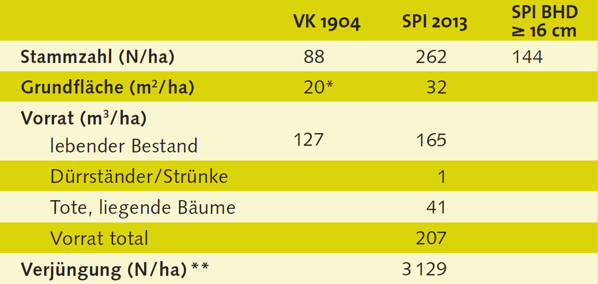 Abb. 5 - Kennzahlen des NWR Tamangur aus der Vollkluppierung (VK) 1904 und der Stichprobeninventur (SPI) 2013. Bei Angaben zur Stammzahl und Grundfläche sind nur lebende Bäume mit BHD ≥ 7 cm (SPI) bzw. ≥ 16 cm (VK) berücksichtigt. Für die SPI wird zusätzlich die Stammzahl mit Kluppschwelle 16 cm angegeben. Die Übereinstimmung des Perimeters der VK und der SPI ist unklar: Die VK wurde auf 26 ha durchgeführt, die SPI auf 41 ha. Weil 1904 grössere, von Wald umgebene Blössen weggelassen wurden, würde sich auf die heutige Reservatsfläche bezogen eine noch geringere Stammzahl ergeben.