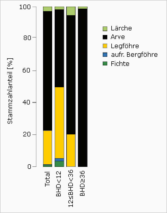 Mit einem Stammzahlanteil von über 75 % nimmt die Arve im NWR Tamangur eine dominierende Stellung ein. Daneben kommen einige Legföhren und wenige Lärchen, Fichten und aufrechte Bergföhren vor (Abb. 3). Oberhalb von BHD 48 cm gibt es nur noch Arven, weshalb diese fast 100% zu Grundfläche und Vorrat beitragen. Entsprechend war der dickste gemessene Baum eine Arve mit einem BHD von 140 cm.