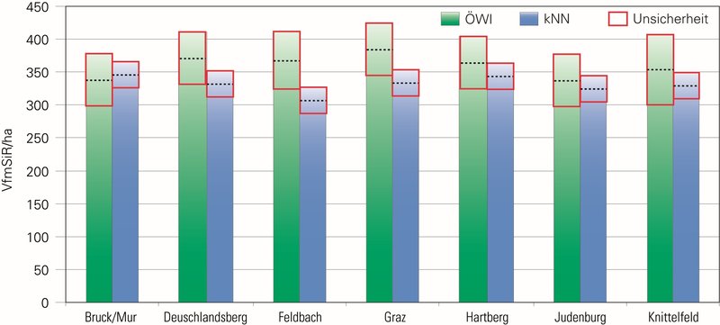 Die Waldinventur wertet traditionell auf Grund der Probeflächenverteilung die Ergebnisse der Felderhebungen auch für Bezirksforstinspektionen (BFI) aus. Damit ist sie aber an der Grenze des statistisch Zulässigen angelangt. Diese BFI-Ergebnisse sind mit einer sehr hohen statistischen Unsicherheit belastet. Die neuen Auswertungen mit der zusätzlichen Information vom Satelliten verringern diese Unsicherheit nun deutlich. Das genaue Ausmaß dieser Verringerung können wir derzeit noch nicht angeben, Abbildung 2 zeigt diese Verringerung daher nur grob angeschätzt.