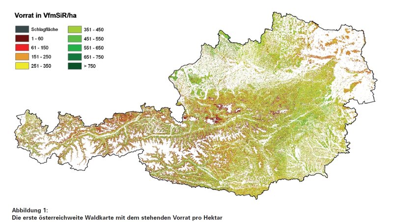 Aufbauend auf Österreichs Waldkarte und Daten der Waldinventur hat das BFW nun neben einer Karte von Baumartenmischungen und Schlagflächen eine Karte des stehenden Vorrats mit der gleichen Methodik erstellt.